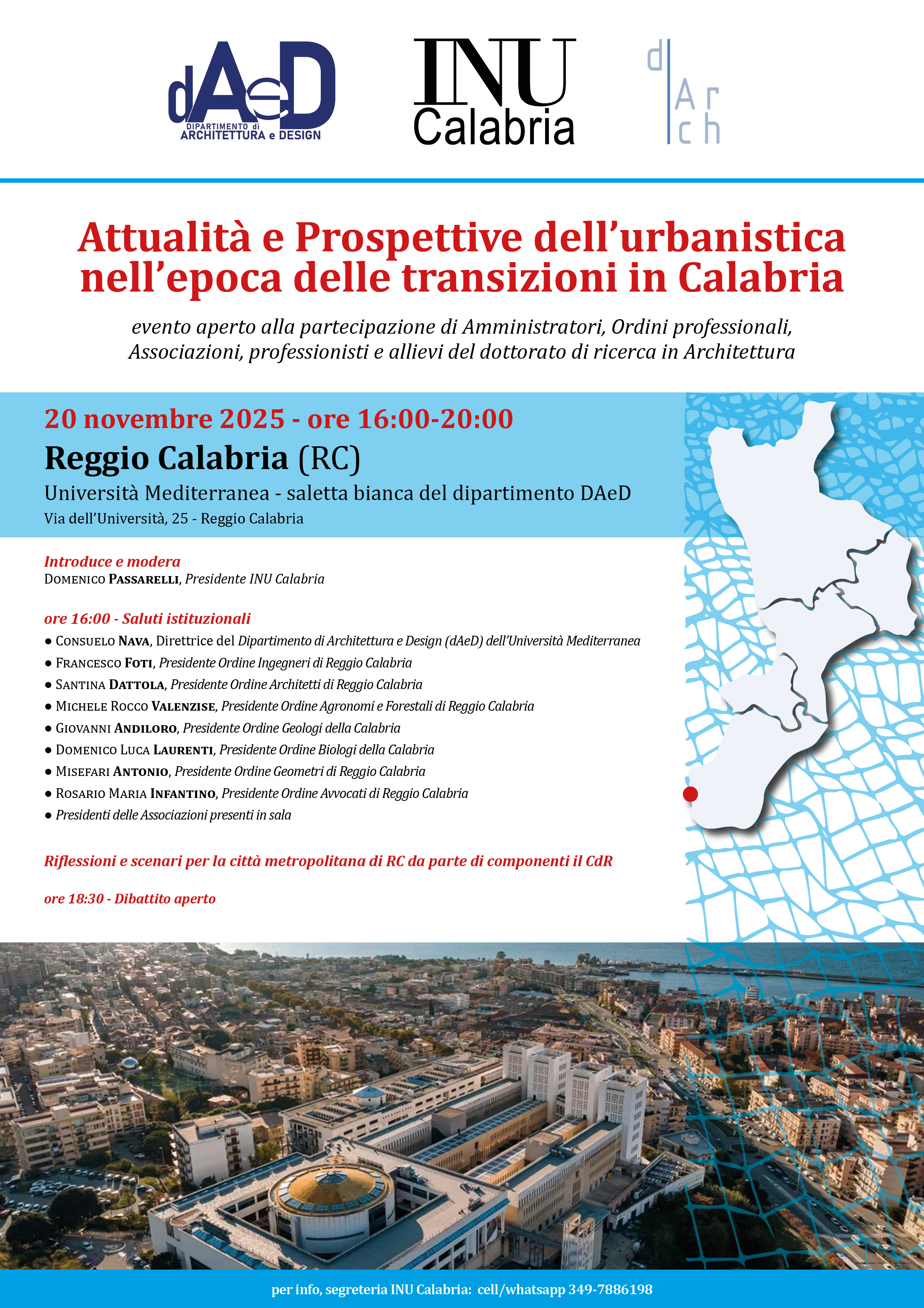 Il prossimo 20 novembre, Consiglio Direttivo Regionale INU si svolgerà in forma aperta al pubblico, a partire dalle ore 16:00, presso l'Università Mediterranea a Reggio Calabria.